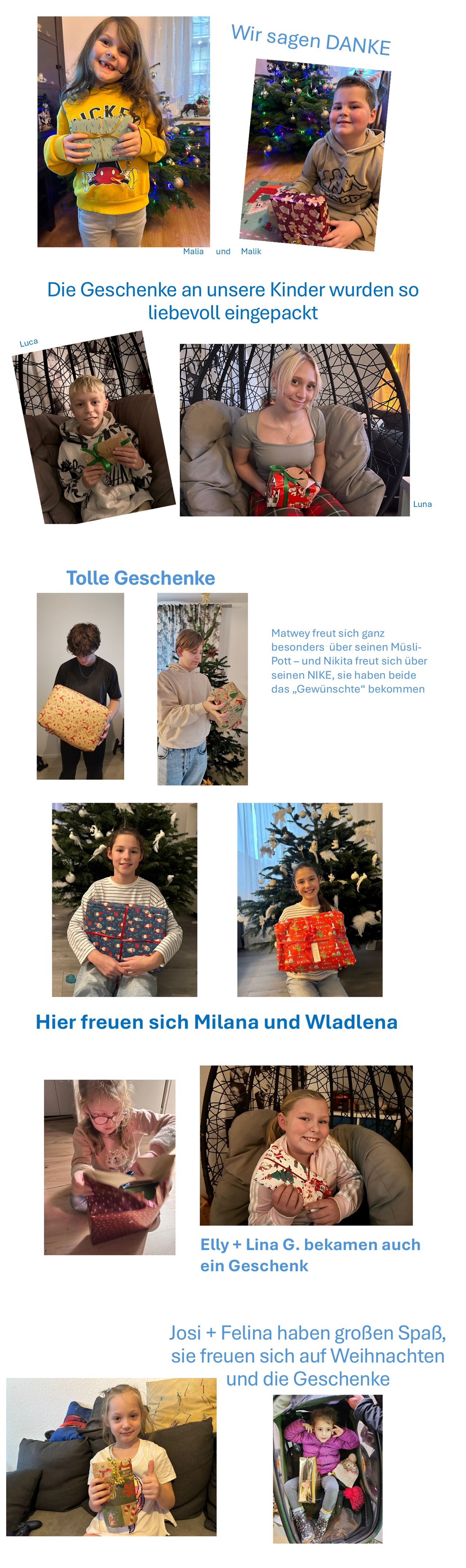 Wir freuen uns sehr über die Bilder mit den glücklichen Gesichtern, die uns jetzt erreichen. Einige der Kinder haben kleine Gedichte auswendig gelernt, um dem Weihnachtsmann zu danken. Ein kleiner Junge hat durch seine Reaktion zu Tränen gerührt: Als er sein neues Federmäppchen auspackte, schrie er vor Begeisterung. Er konnte kaum glauben, dass der Weihnachtsmann ihm diesen teuren Wunsch erfüllt hat, da er weiß, dass seine Eltern sich solche Geschenke leider nicht leisten können. Viele der Wünsche kamen von Kindern aus der Ukraine, die sich zum Fest riesig über die Post aus Düsseldorf gefreut haben.