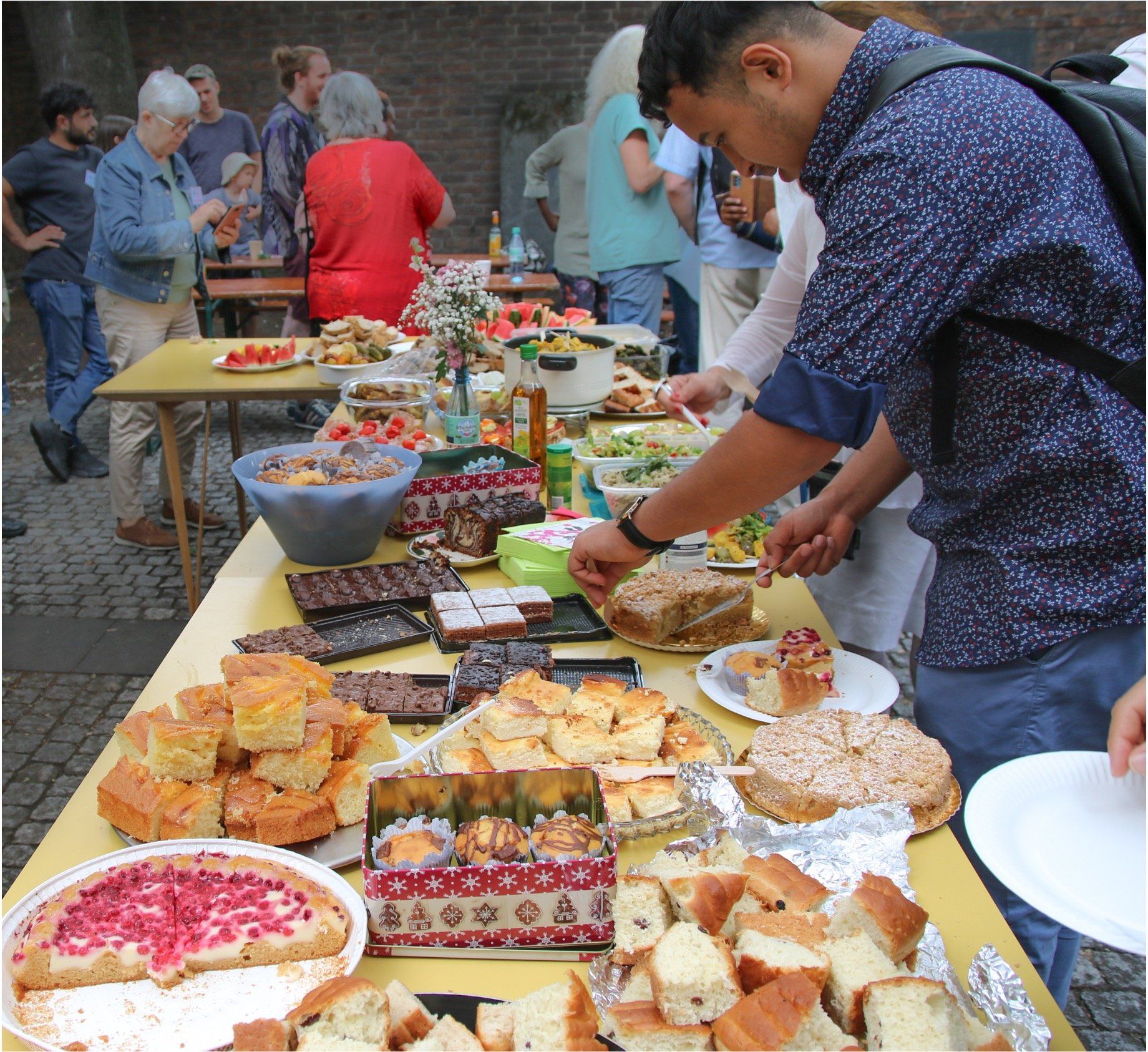Im Anschluss wurde im Hof der Berger Kirche getanzt: Samaila Diakitegab mit einer Trommeleinlage den Rhythmus vor, gefolgt von Katayoun mit der Band Rokhbam, welche im alt iranischen Musikstil mit Gesang und Trommeln ebenfalls die Tanzfläche füllten. Kuchen und unterschiedlichste herzhafte Speisen schmückten das Buffet und Ina Holderbaum zog mit Kinderschminke und Diana Drechsler mit ihrer Märchenstunde die Kinder auf der Veranstaltung in ihren Bann. Einen musikalischen Ausklang fand das Fest mit Maika Küster mit Gesang und Gitarre, Benedikt ter Braak mit Gitarre und Jan Krause am Klavier.