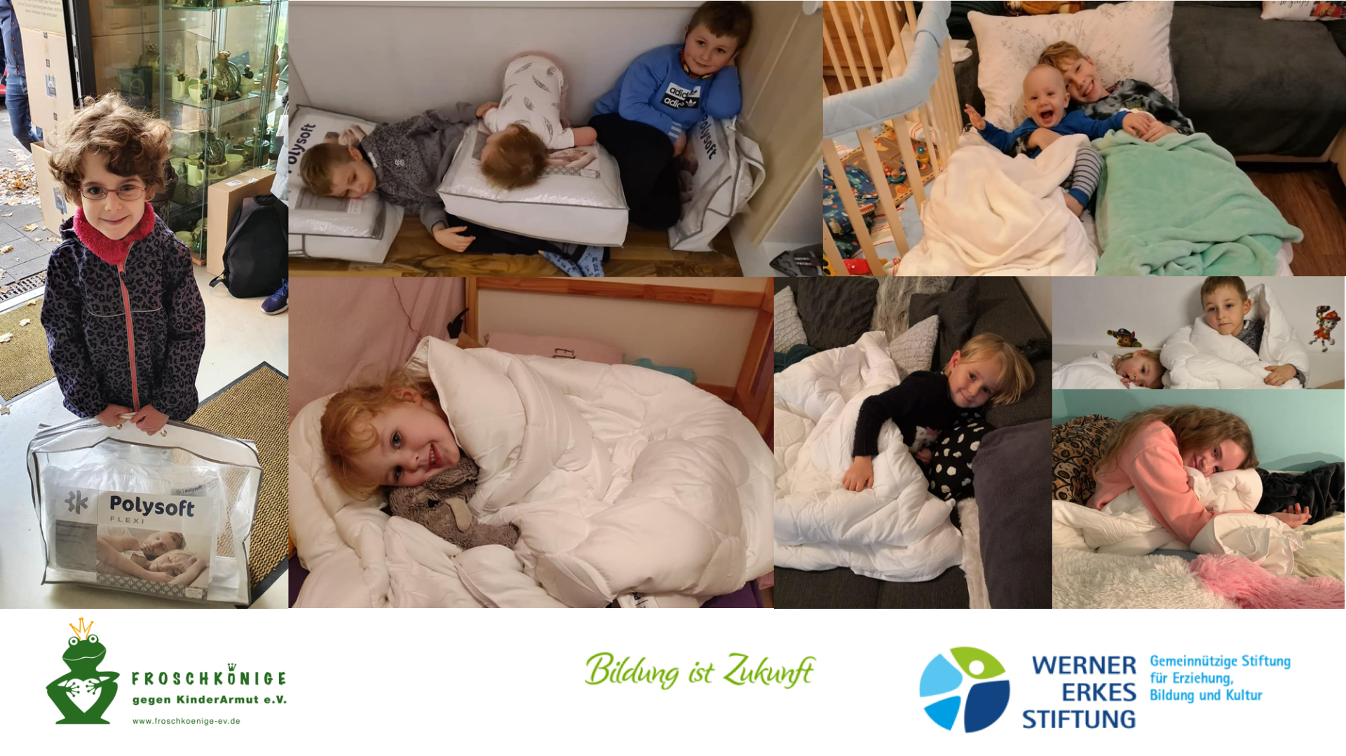Froschkönige gegen KinderArmut e. V. ist ein kleiner privater Verein, der arme Kinder und Familien mit den nötigsten Dingen unterstützt. Um zu vermeiden, dass eine 2. Hartz4-Generation heranwächst, sieht der Verein eine langjährige Förderung der Kinder vor. Aus den regelmäßigen Besuchen bei den Familien, wussten die Ehrenamtlichen der Froschkönige, dass viele Kinder alte, kaputte oder gar keine Bettdecke haben. In armen Familien ist dafür kein Geld übrig und es wird an allen Ecken und Enden gespart.