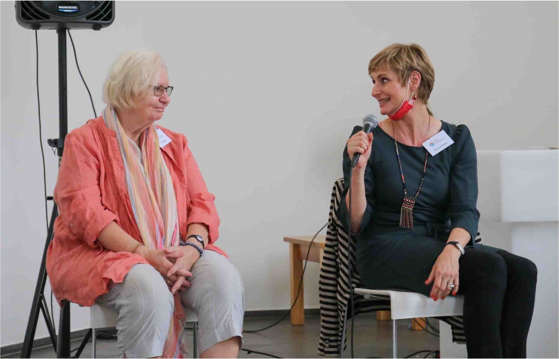 Eröffnete wurde die Veranstaltung durch eine Gesprächsrunde unter der Moderation von Dr. Cinur Ghaderi, Professorin für Psychologie an der Universität Bochum und ehemalige psychologische Psychotherapeutin im PSZ. Mitarbeiter*innen aus unterschiedlichen Bereichen des PSZs verdeutlichten die Interdisziplinarität des Teams und erzählten vom Arbeitsalltag und aktuellen Herausforderungen. So berichtete beispielsweise Barbara Esser, Verfahrens- und Sozialberaterin im PSZ, wie schwierig aktuell die Unterstützung von afghanischen Klient*innen sei, deren Familien in Afghanistan nach der Machtübernahme der Taliban inzwischen seit einem Jahr akut bedroht bzw. z.T. in Nachbarländer geflohen und rechts- und mittellos seien – was eine enorme psychische Belastung erzeugt und komplexe rechtliche Fragestellungen in der Beratung aufwerfe.
